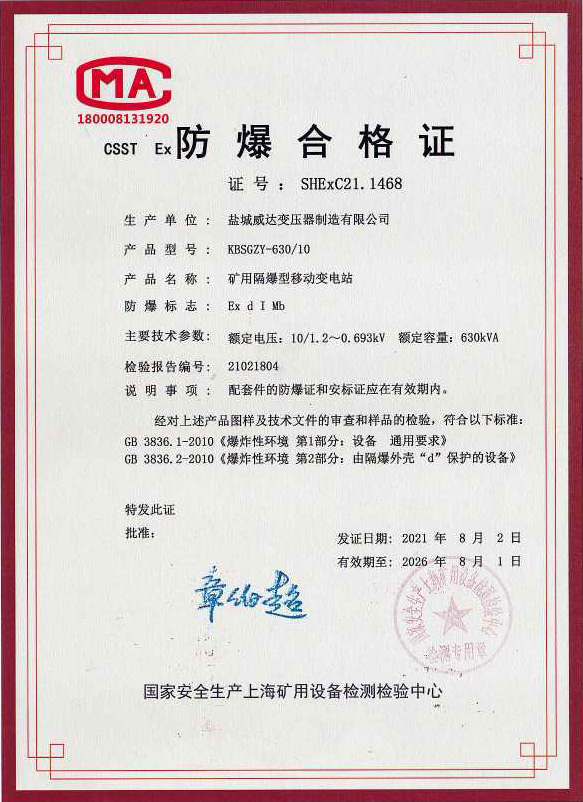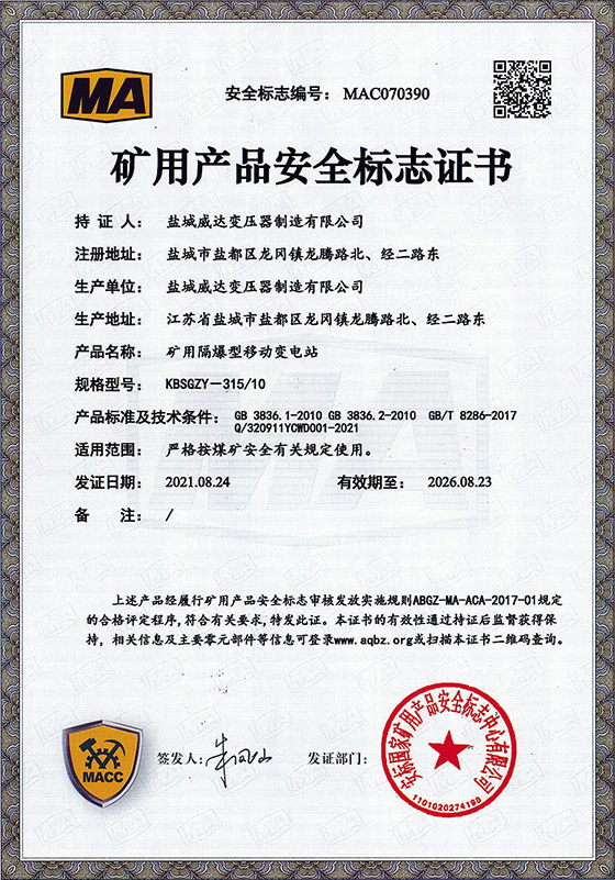 鹽城威達變壓器制造有限公司主要生產產品有KBSGZY系列礦用隔爆型移動變電站、KBSG系列礦用隔爆型干式變壓器、礦用一般型電力變壓器、干式變壓器、組合式變壓器、箱式變電站、低壓成套設備及特種變壓器。KBSG、KBSGZY系列礦用防爆變壓器廣泛用于有甲烷混合氣體和煤塵,且有爆炸危險的礦井中,作為礦井下泵站、運輸機、采掘機等用電設備的配電裝置。